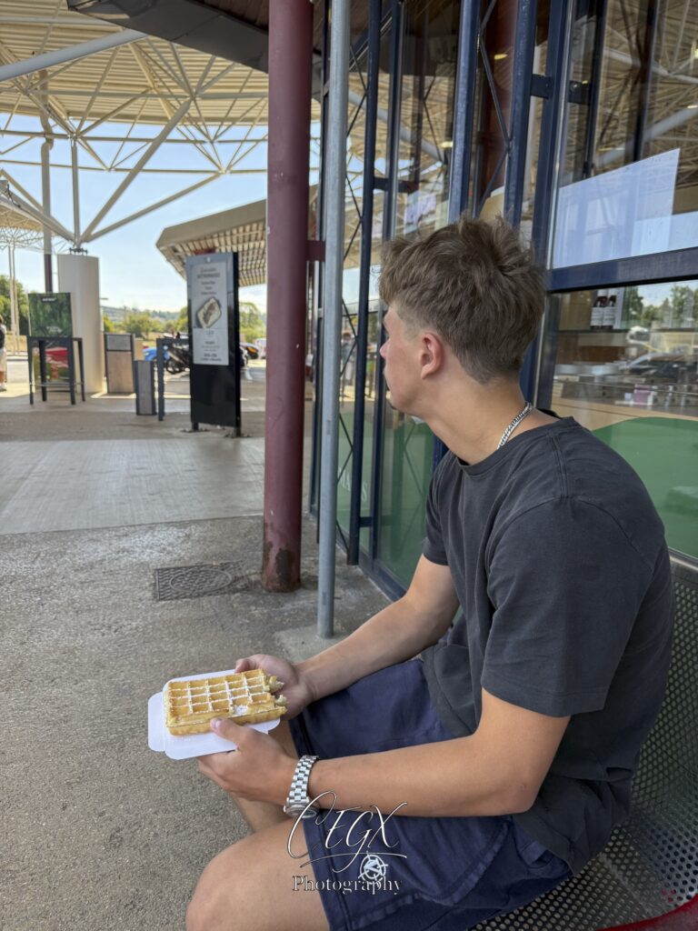 Sur la route… Cédric a envie d’un gaufre… Vraiment, ce fut sympa de faire cette longue route avec le “gamin” qui a tellement grandi ces derniers mois…