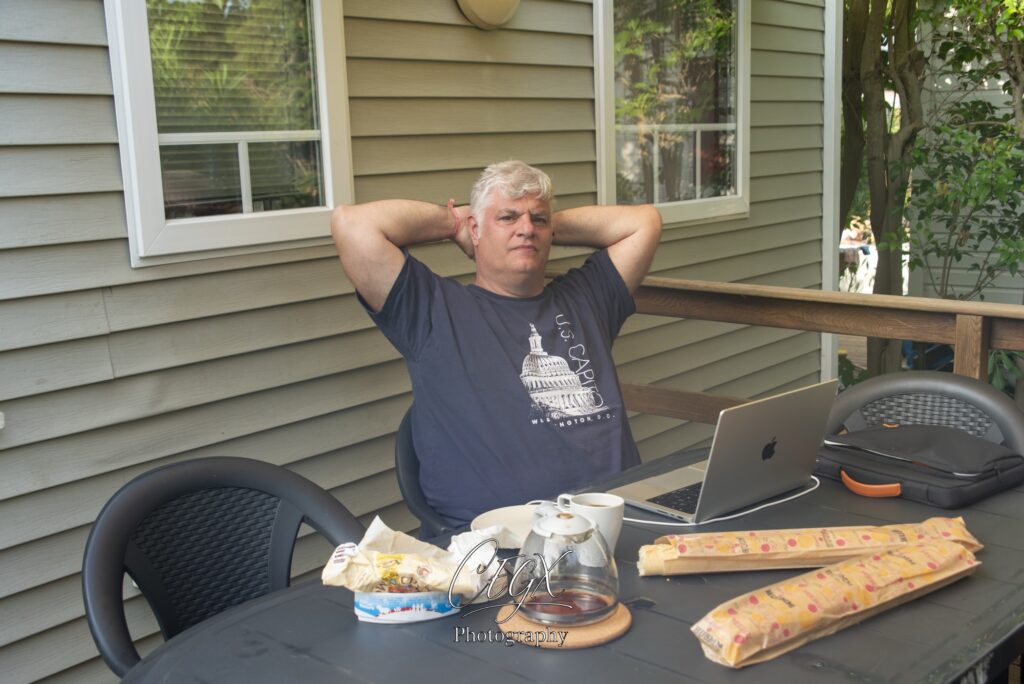 Petit déjeuner simple avec une baguette et le Mac pour regarder les photos de la veille….