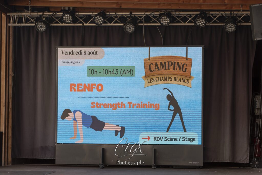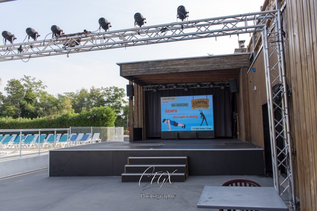 Vous avez aussi le podium… Podium pour les spectacles le soir, mais nouveauté, écran géant sur le podium pour regarder les match de foot 🙂 ou pour présenter le programme de la journée…
